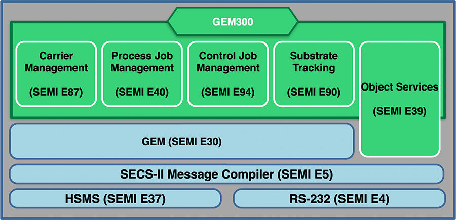 GEM300 is built on top of SECS/GEM standards as illustrated in the diagram below: