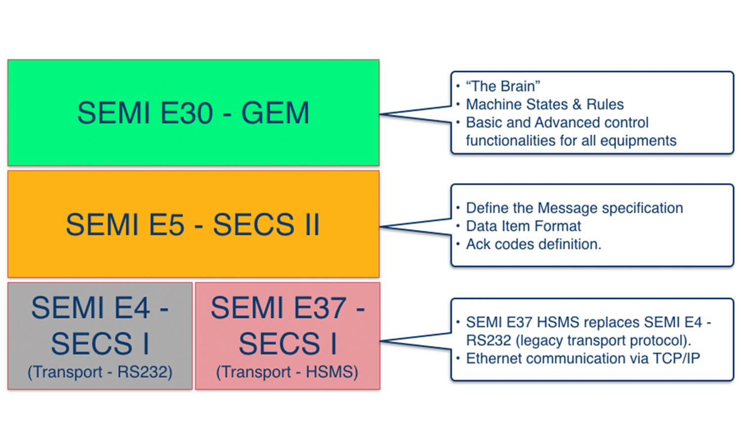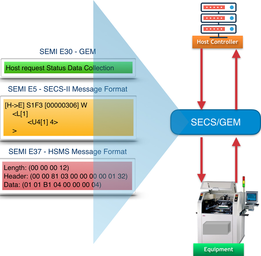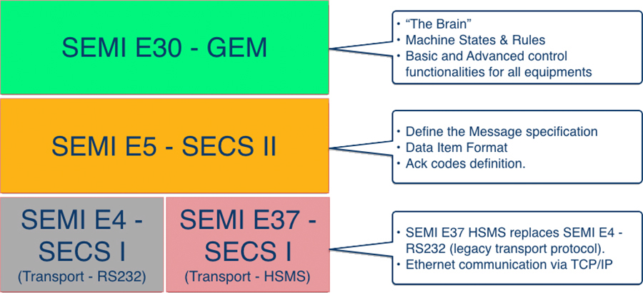 SEMI E30 GEM Standard - This is the "Brain" that defines the behaviours of equipment (Business Rules), state machine and some rules like which SECS-II messages should be used, in what situations, and what the resulting activity should be. It also defines the functionalities like Status Data Collections, Trace Data Collection, Alarms Management, Spooling, Remote Command, etc.