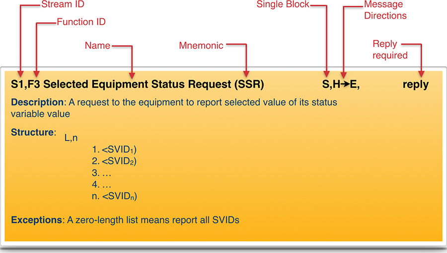 As described in the article’s introduction section, this standard provides the APIs for interfacing between Host and Equipment. In this standard, each message is represented in Function and grouped in Stream (category).